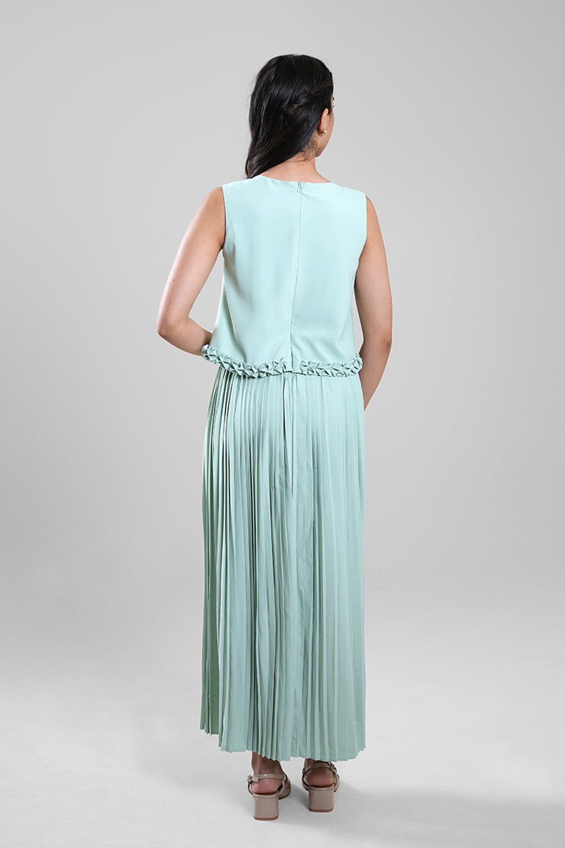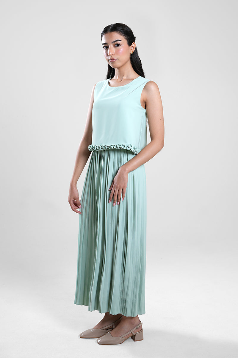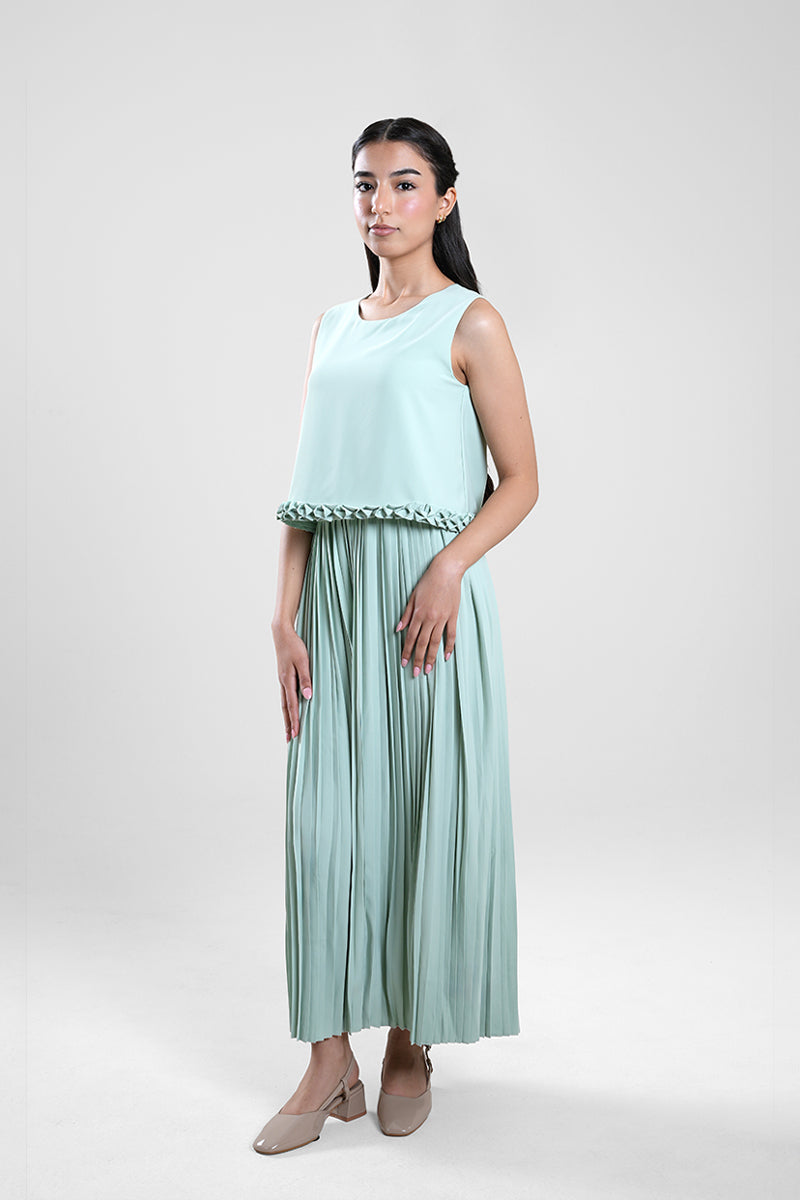فستان بطول ميدي يتميز بجزء علوي ناعم بدون أكمام وتنورة مطوية تضيف حركة وانسيابية. يأتي بتفصيل خفيف عند الخصر يمنح توازناً للقصة دون مظهر ضيق. تصميم عملي وأنيق يناسب الإطلالات اليومية والمناسبات الهادئة.