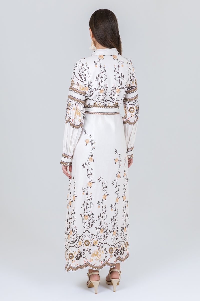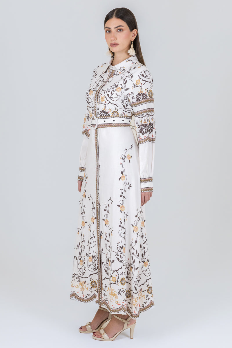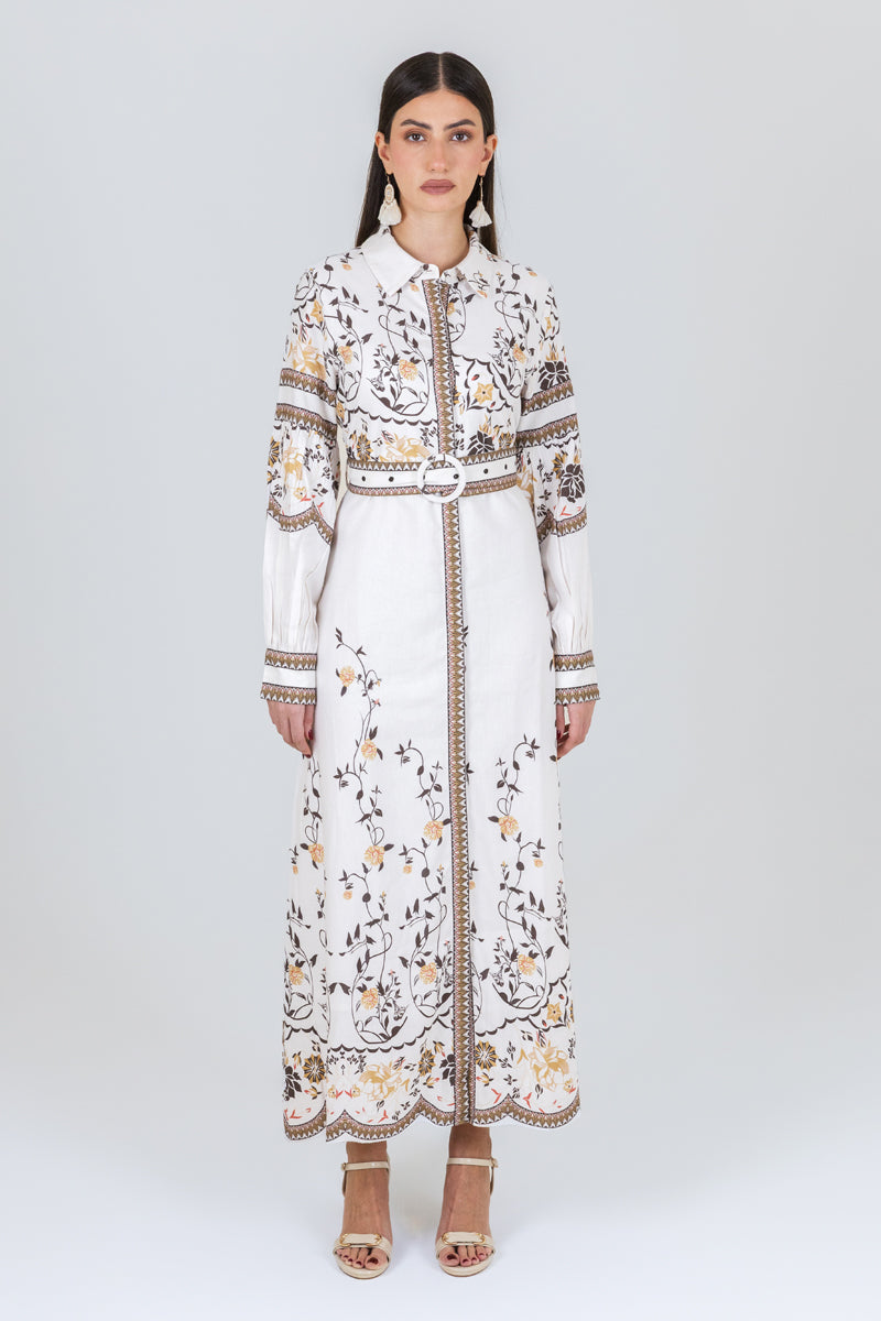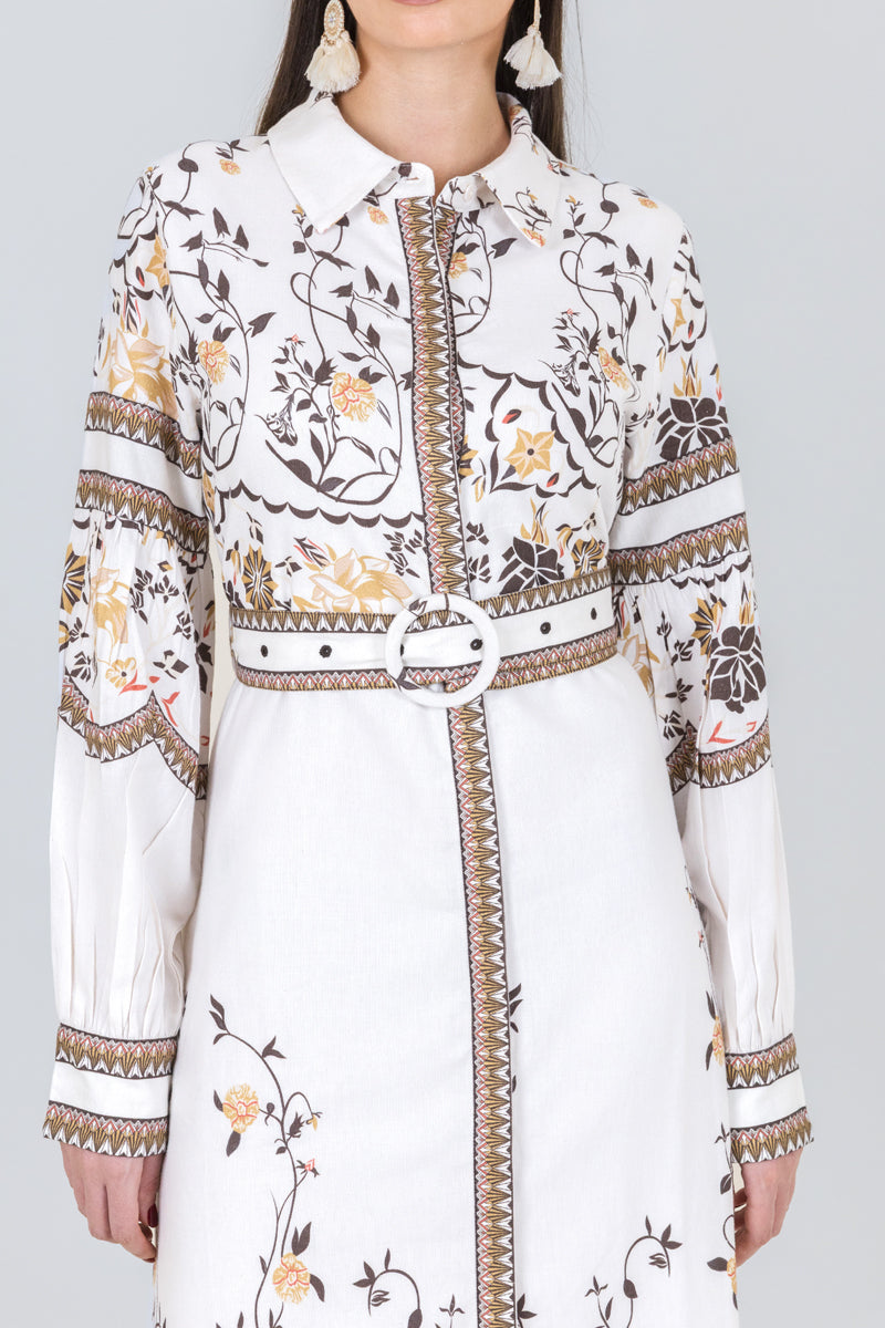 فستان قميص بطول ماكسي يتميز بنقشة نباتية أنيقة وتصميم بأزرار أمامية مع حزام يحدد الخصر. قصة مستقيمة تمنح مظهراً متوازناً وسهولة في التنسيق لمناسبات مختلفة