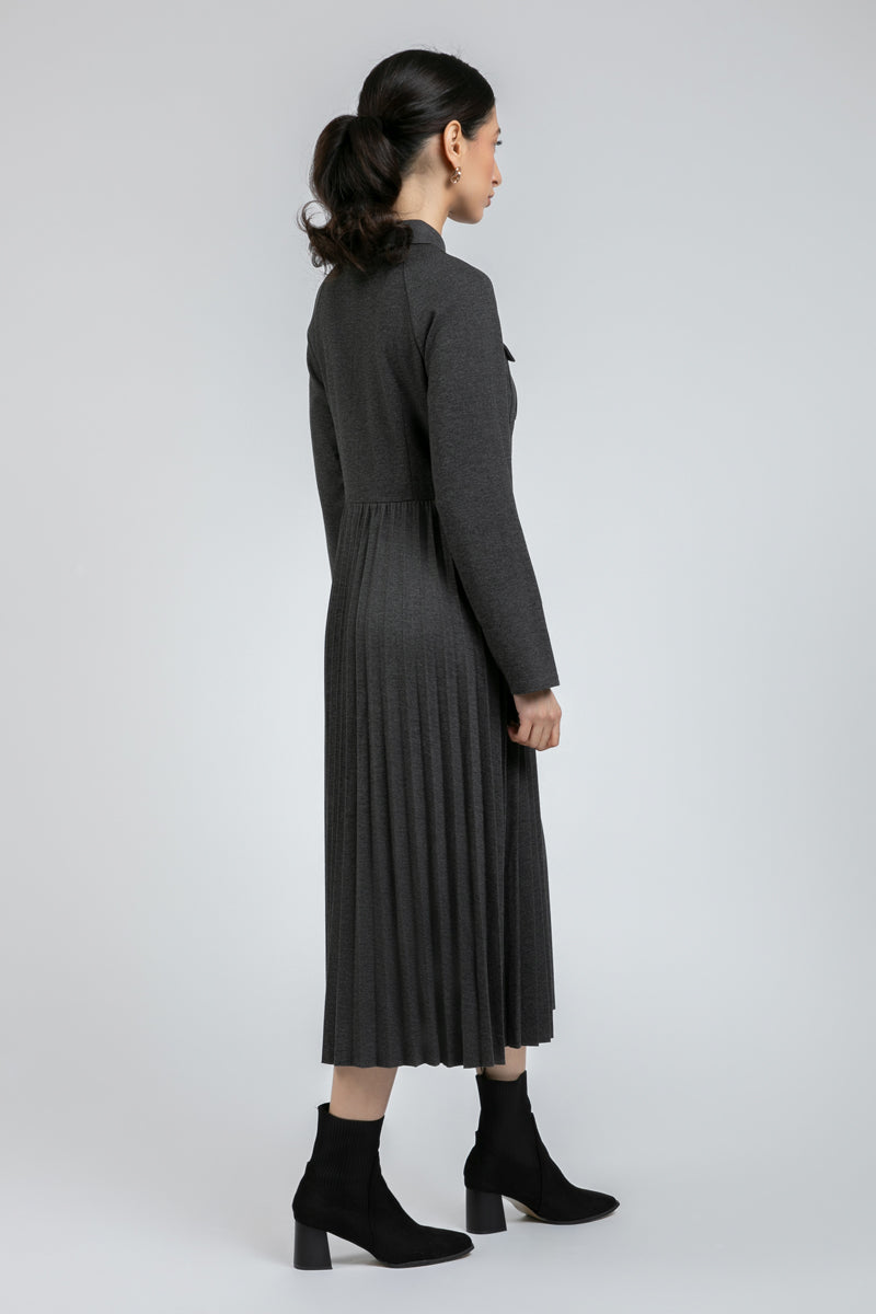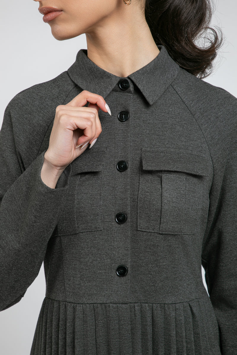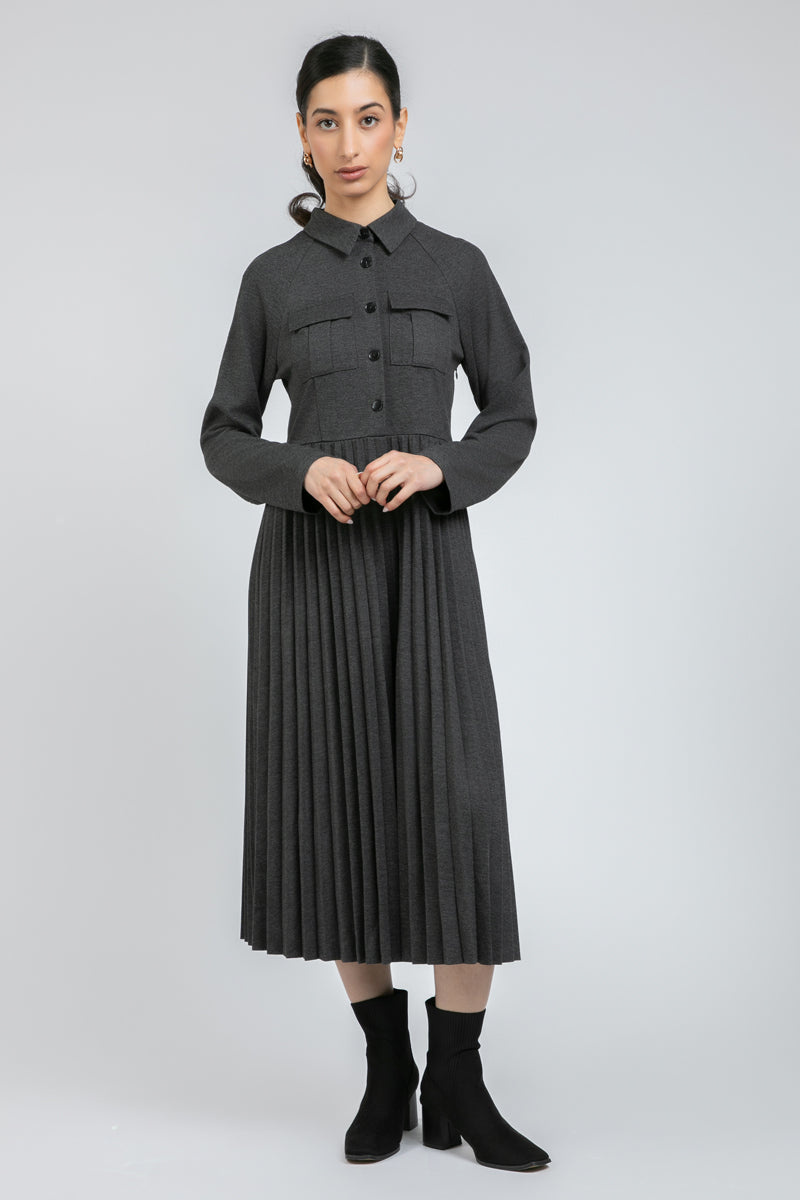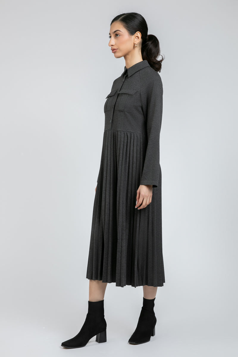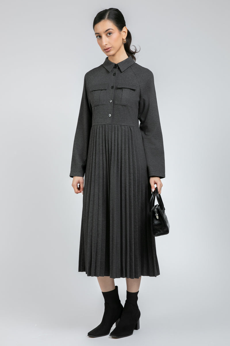 فستان أنيق بأكمام طويلة يتميز بجزء علوي منظم وتنورة بكسرات ناعمة تمنح حركة وانسيابية. مزود بياقة كلاسيكية وإغلاق بأزرار أمامية مع قصة مريحة ومحددة في الوقت نفسه. مناسب لإطلالات العمل، الخروجات اليومية، والمظهر الأنيق العملي.