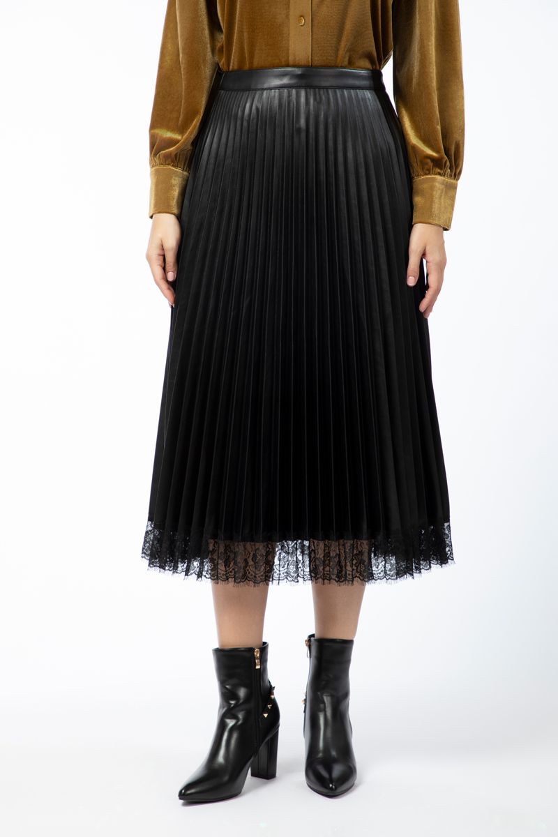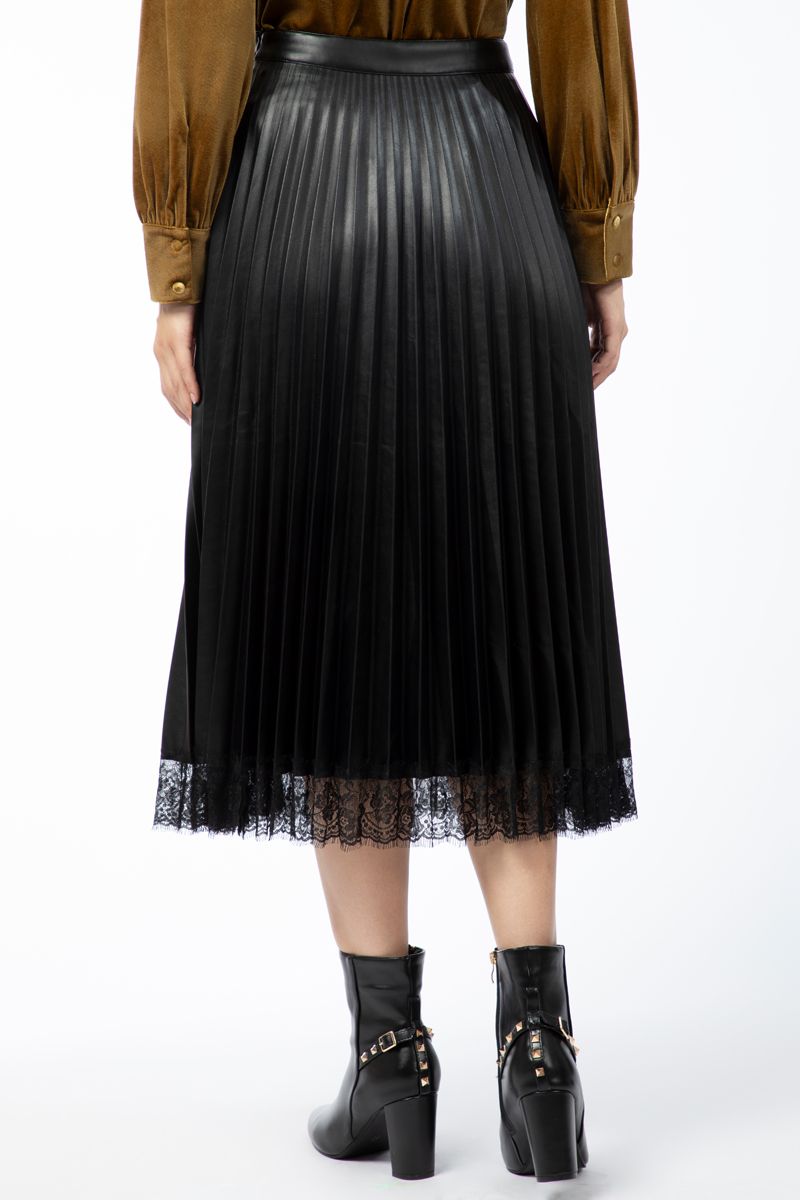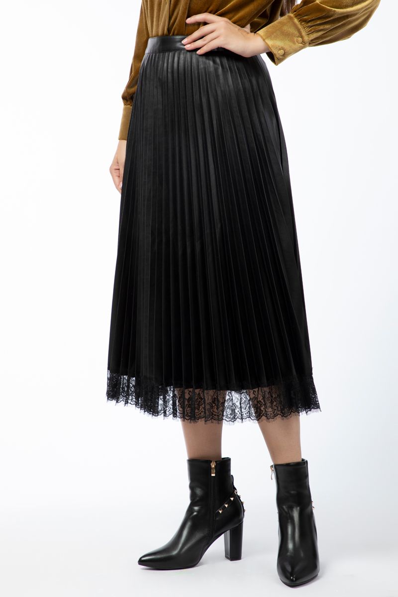 تنورة جلد صناعي نسائية بكسرات وتفاصيل دانتيل