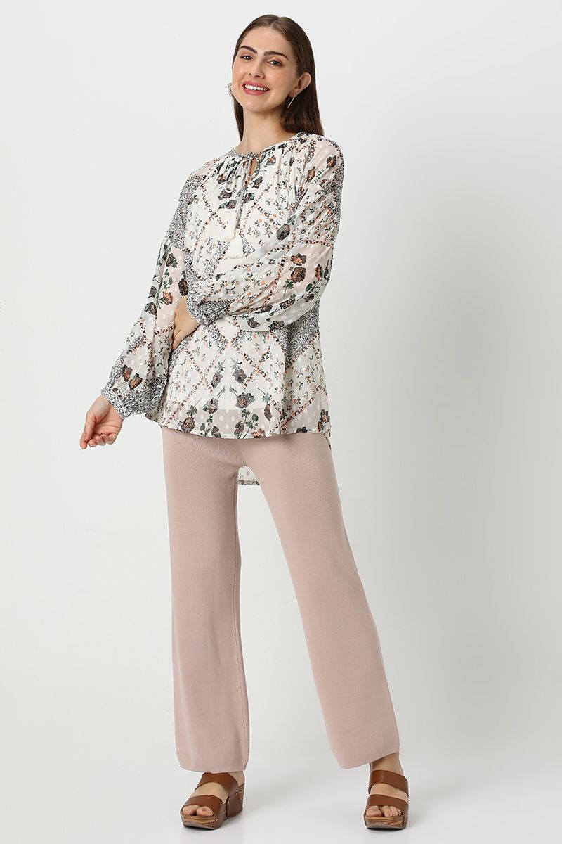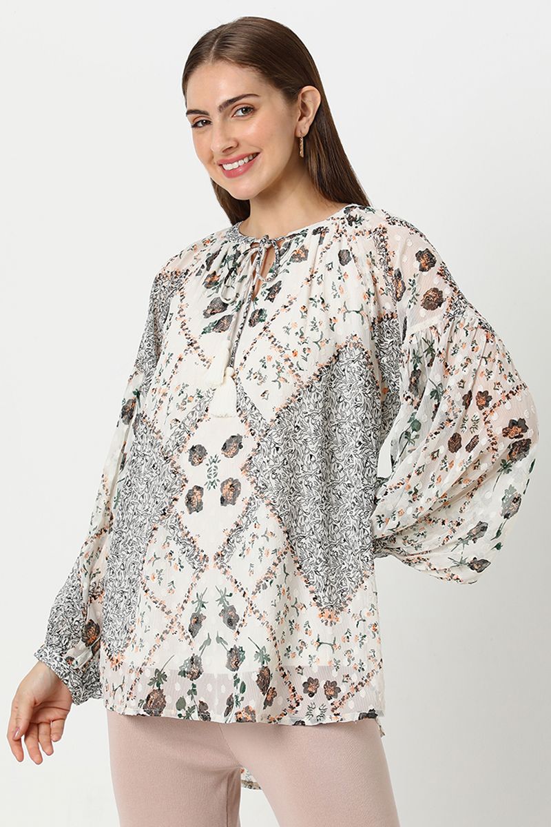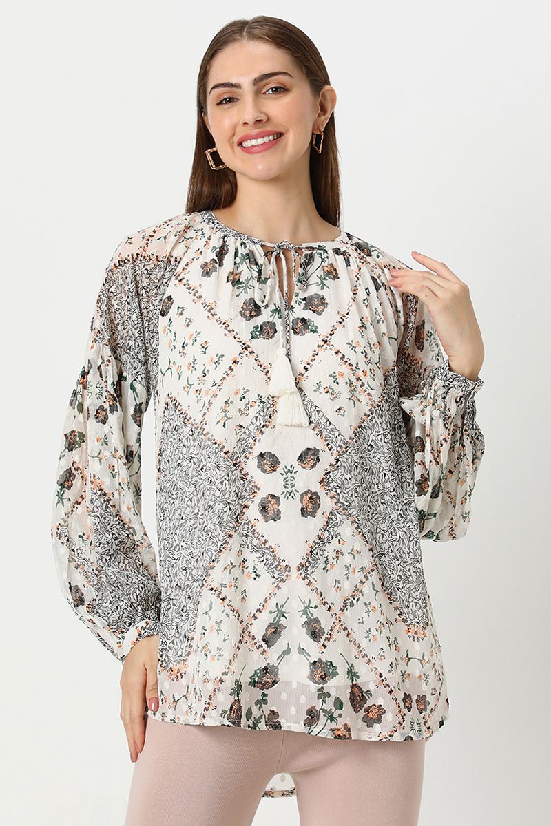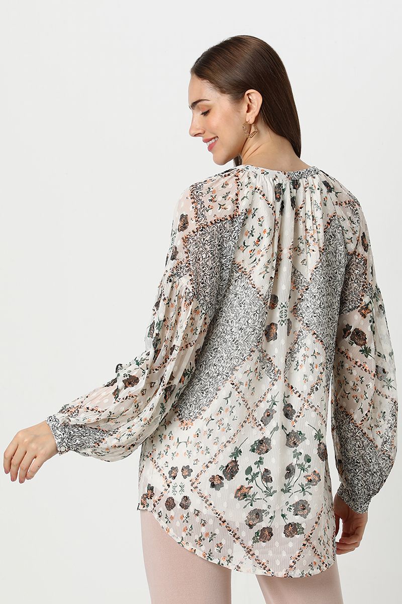 بلوزة نسائية بطبعات ورباط على الرقبة