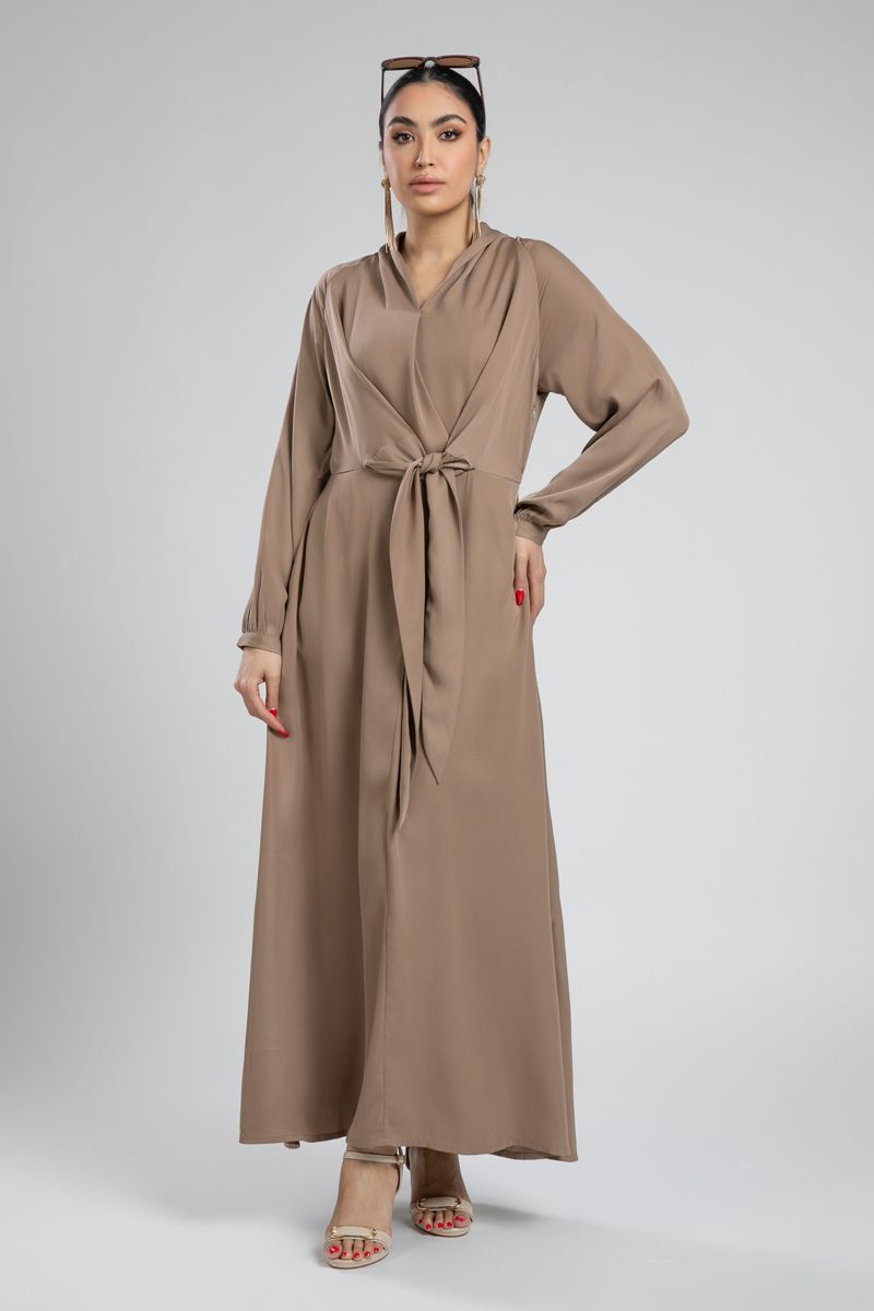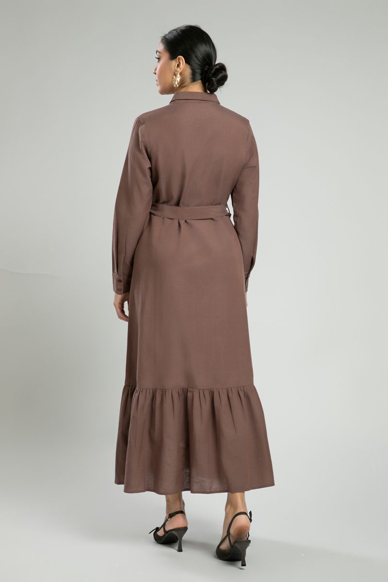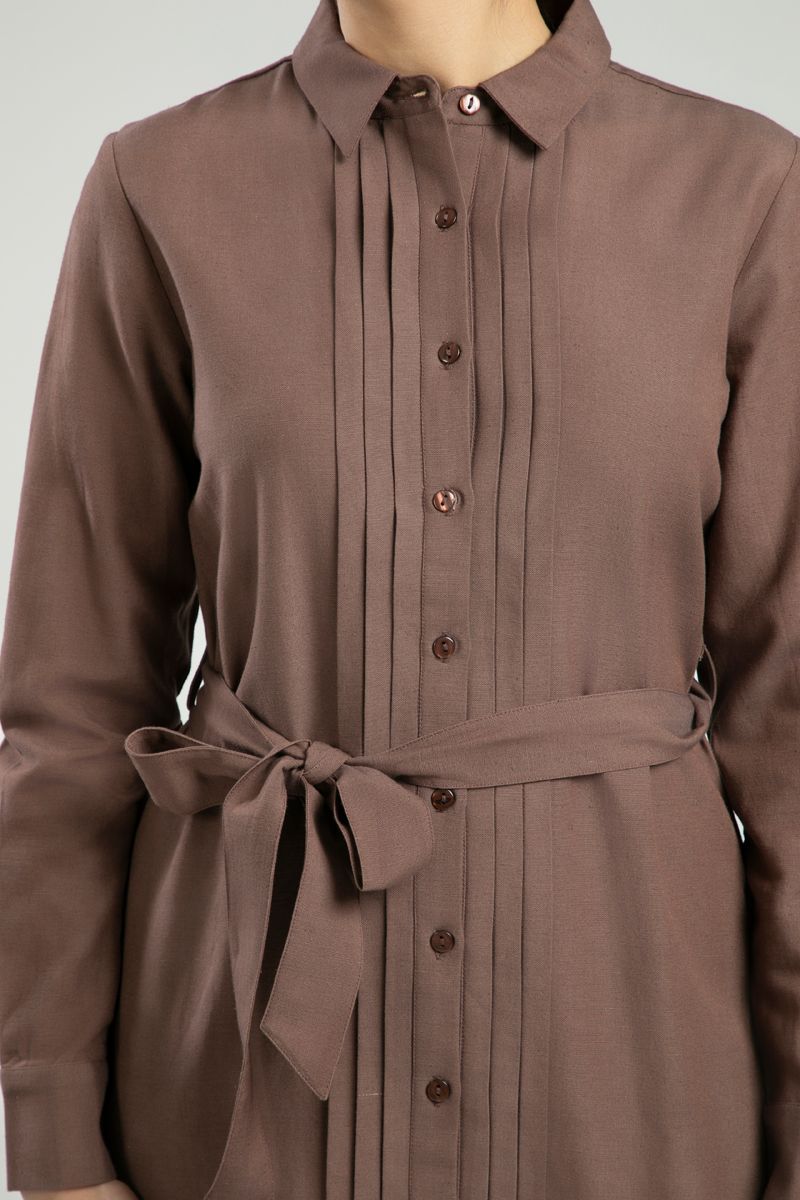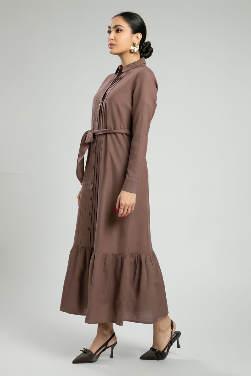 فستان ميدي بقصة قميص وأزرار أمامية مع حزام من نفس القماش يتميز بثنيات أمامية أنيقة وتفاصيل تطريز ناعمة وحاشية سفلية مجمعة تمنح الإطلالة انسيابية ونعومة