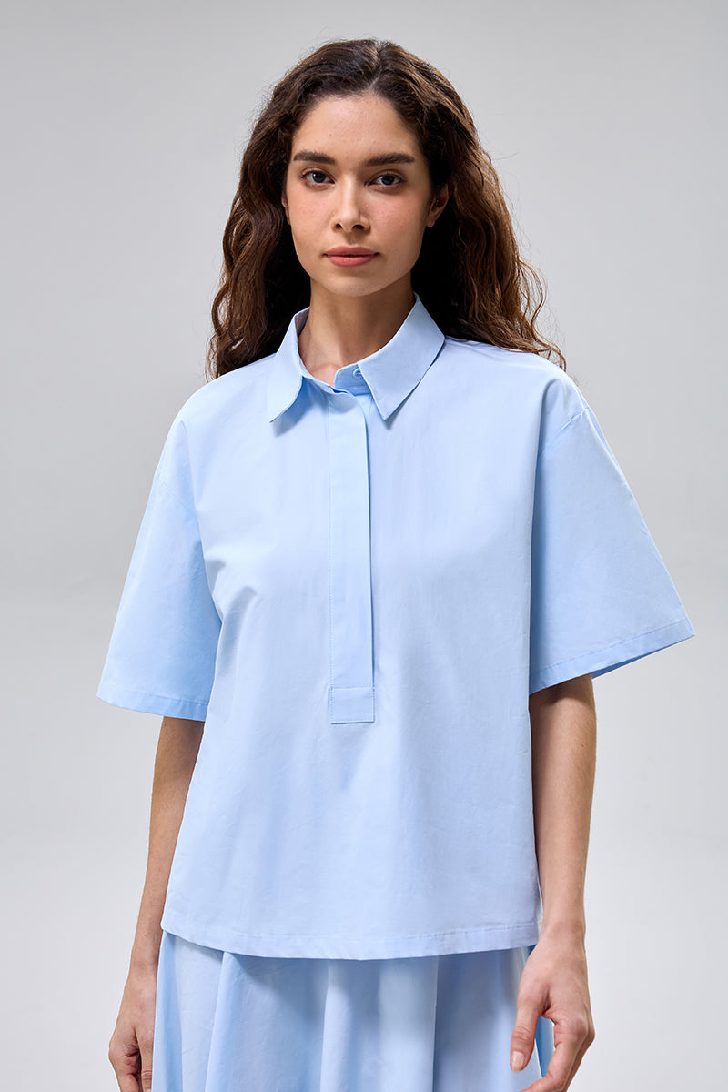 بلوزة بتصميم عصري بأكمام قصيرة وياقة مرتبة مع إغلاق أمامي مخفي يمنح مظهرا نظيفا وأنيقا مصنوع من قماش خفيف ومريح مناسب للارتداء طوال اليوم يتميز بقصة مستقيمة مريحة يسهل تنسيقها مع بنطلون واسع أو تنورة أو طقم متناسق مناسب للإطلالات اليومية والستايل الكاجوال الراقي والموضة المحتشمة الحديثة قطعة أساسية في خزانة الملابس العصرية