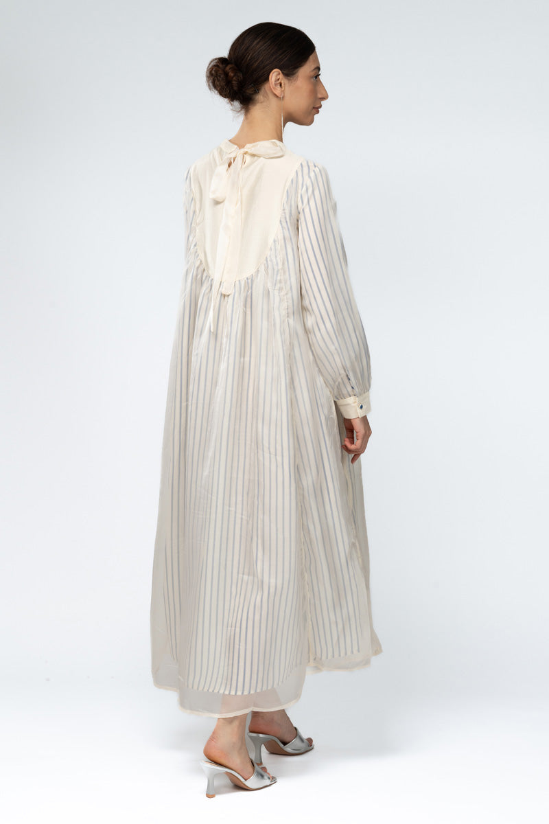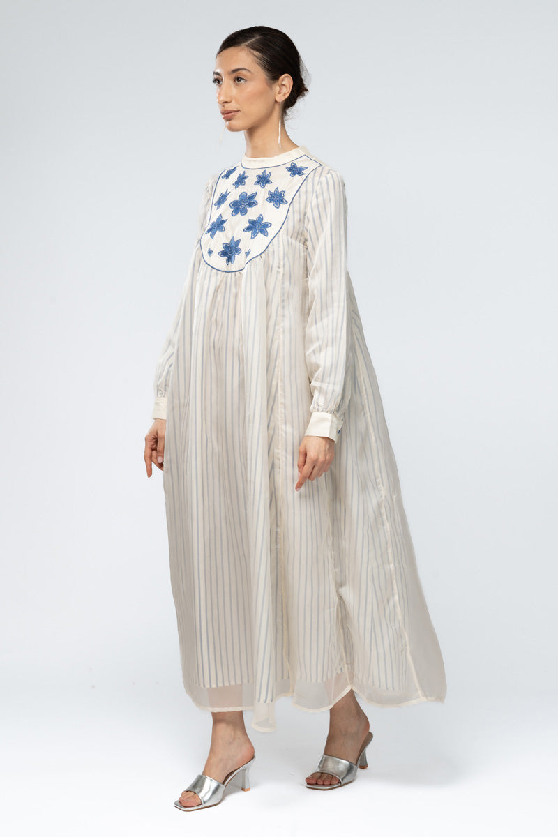 فستان طويل بتصميم مريح مع نقش مخطط خفيف وصدرة مزينة بتطريزات زهرية أنيقة. يأتي بأكمام طويلة مع كسرات ناعمة تمنح القماش انسيابية جميلة، ومصنوع من خامة خفيفة تناسب الارتداء اليومي. قطعة عملية يمكن تنسيقها بسهولة لإطلالات هادئة ومريحة.
