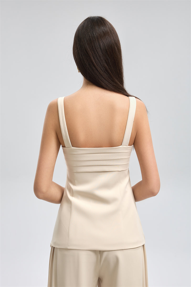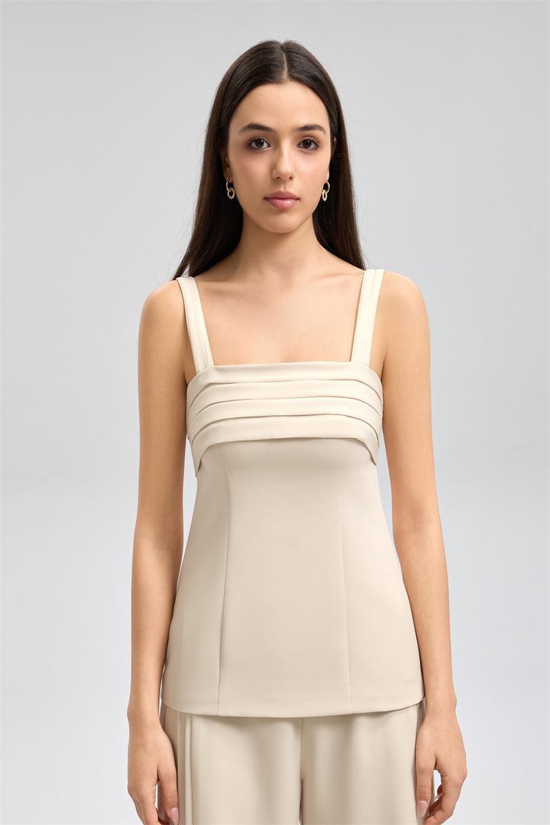 بلوزة أنيقة بحمالات عريضة تمنح ثباتًا وانسيابية في الارتداء، مع طبقات مطوية في الجزء العلوي تضيف لمسة ناعمة للتصميم. تأتي بقصّة مستقيمة تعزز الإطلالة المريحة والراقية، ويمكن تنسيقها بسهولة مع مختلف القطع لإطلالة عملية ومتناسقة.