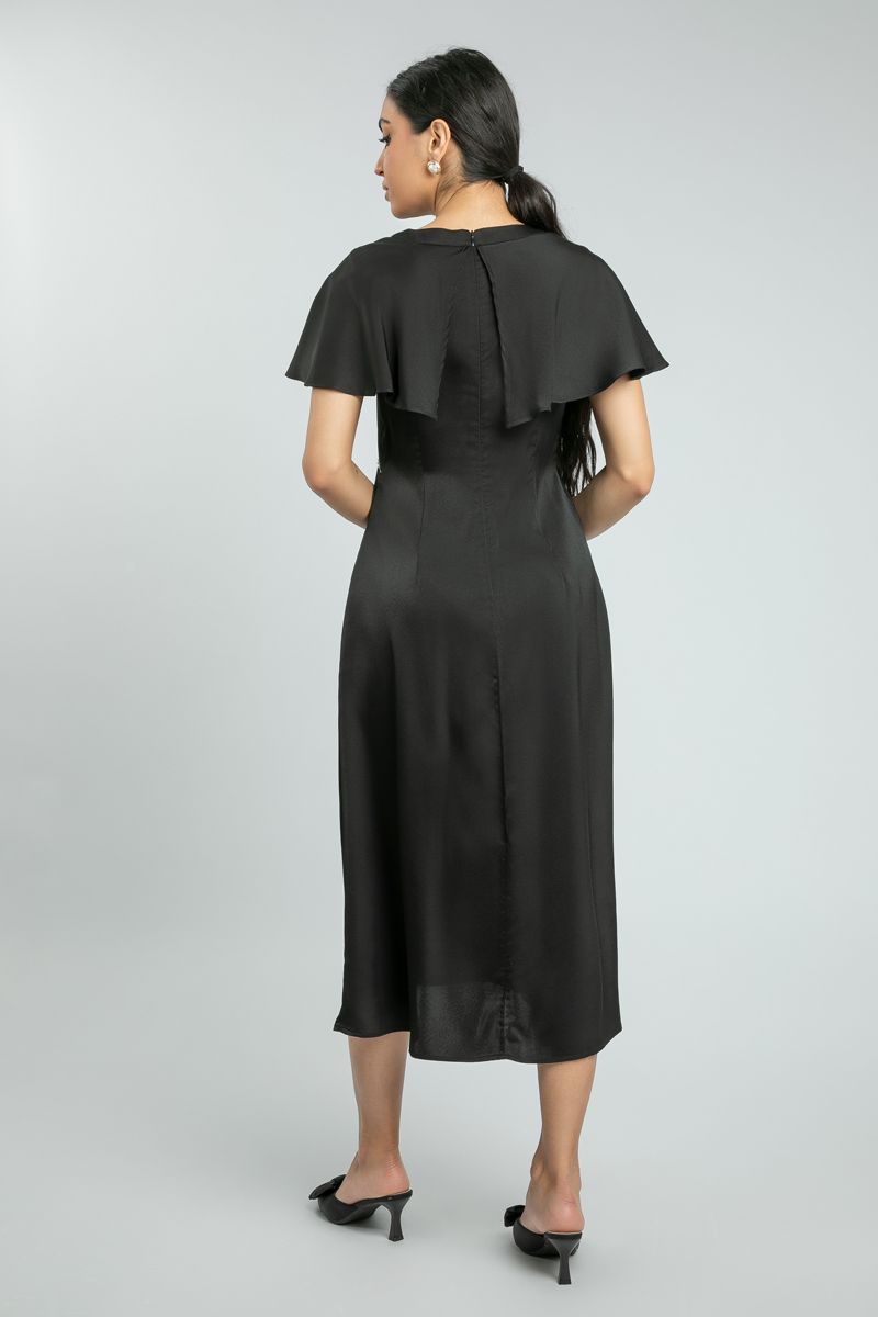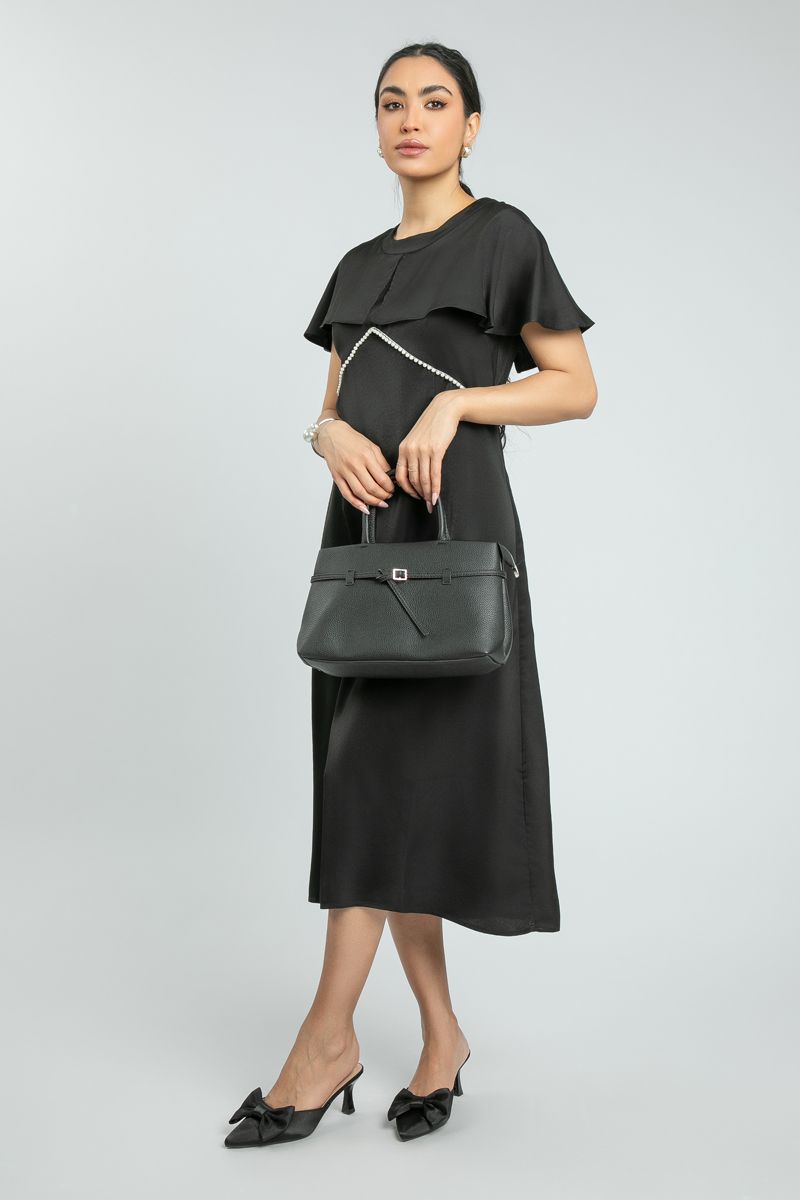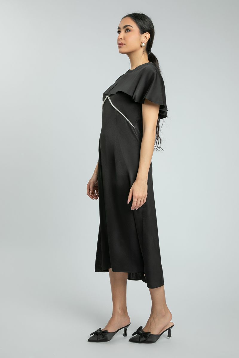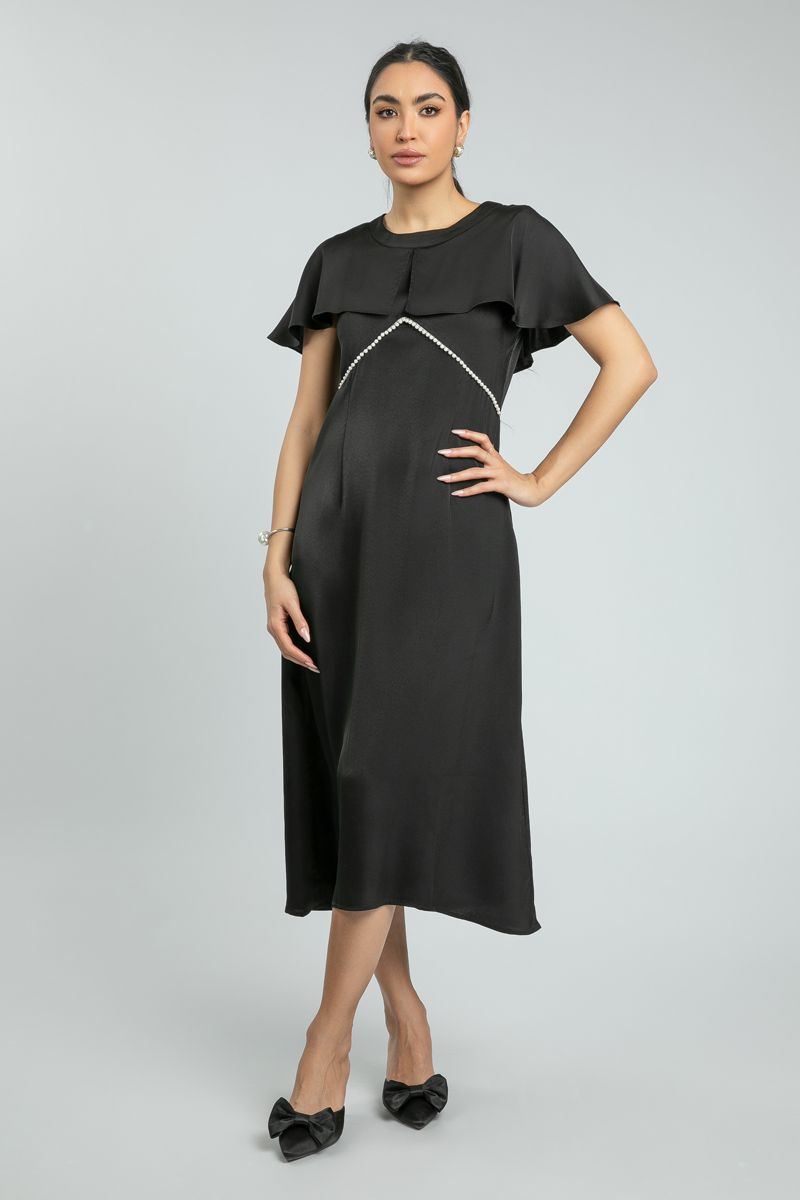 يتميز هذا الفستان الميدي الأنيق للنساء بقماش الساتان الرقيق، مما يضفي عليه إحساسًا فاخرًا. تضيف طبقة الكاب القصيرة على الجهة العلوية لمسة من الأناقة، بينما يزينه خط من الخرز اللؤلؤي على الجهة الأمامية، مما يمنحه لمسة راقية ومتطورة. مع سحاب خلفي للإغلاق وعنق دائري، يجمع هذا الفستان بين الأناقة والراحة، مما يجعله مثاليًا للمناسبات الرسمية أو الخاصة.