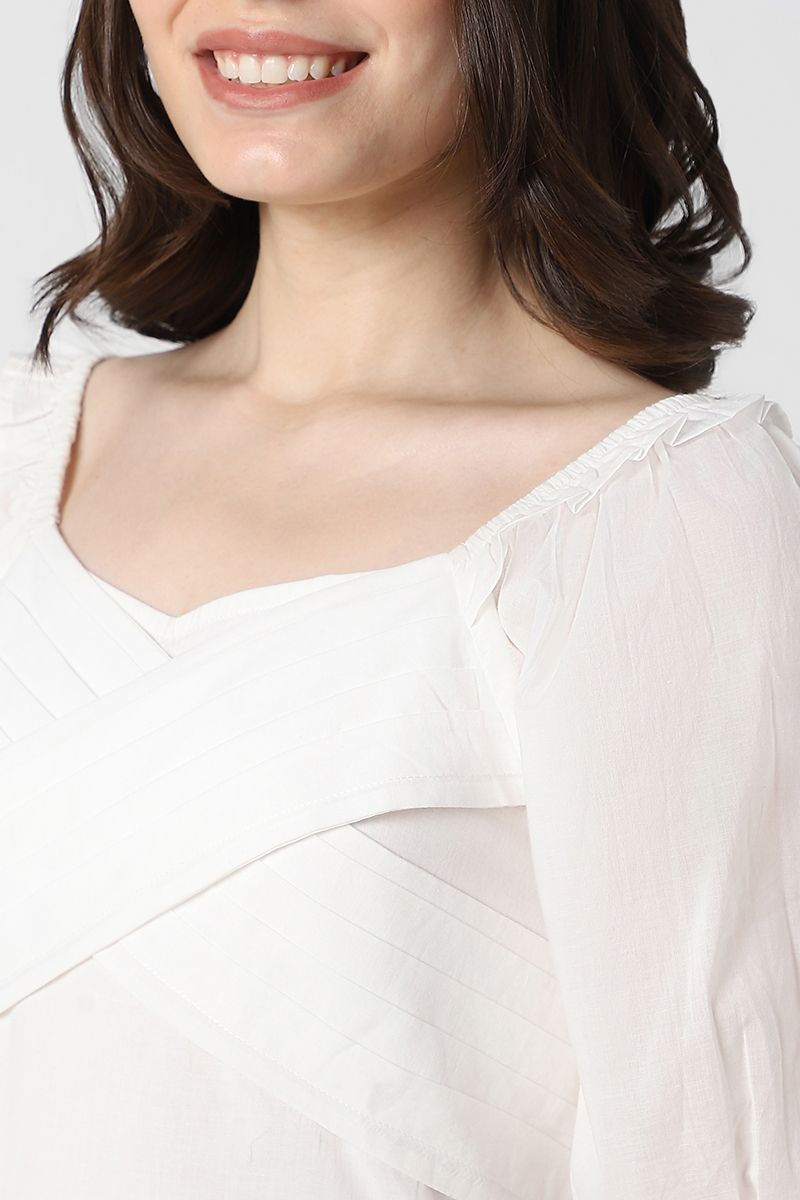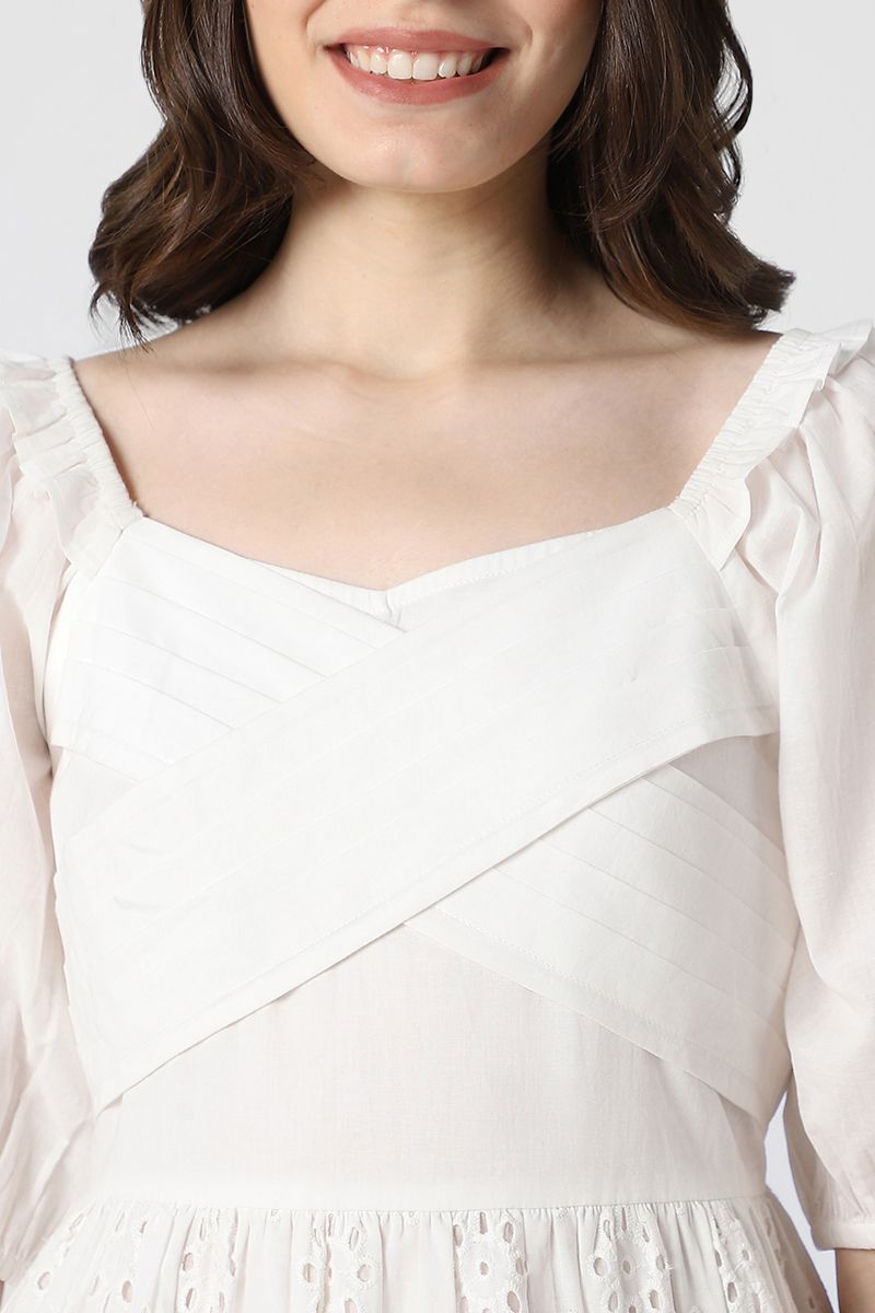 مزين بتفاصيل أشرطة مدروزة ومتقاطعة من الجهة الأمامية، وتفاصيل فتحات مخرمة مطرزة على الجزء السفلي