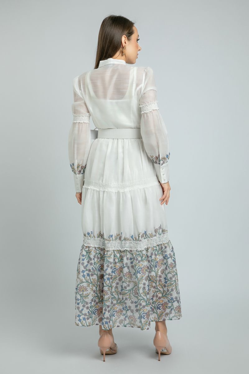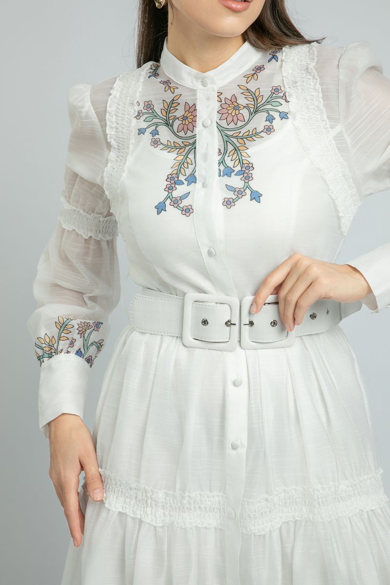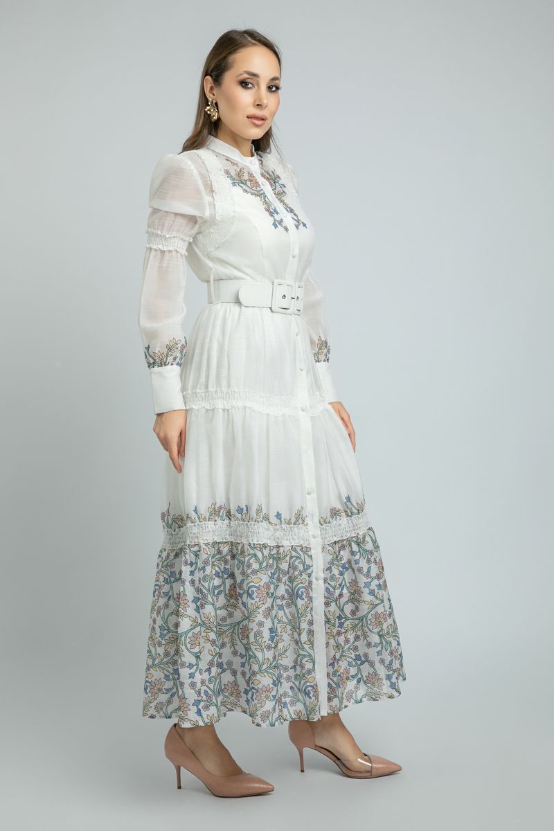 استمتعي بإطلالة أنثوية أنيقة مع هذا الفستان الطويل ذو الأكمام الطويلة، المزخرف بطبع ورود ملونة تضفي عليه حيوية خاصة. يأتي مع إغلاق بأزرار أمامية وياقة دائرية تضيف لمسة كلاسيكية، فيما يضفي الحزام القابل للتعديل بإبزيم على الخصر لمسة جمالية أنثوية. فستان متعدد الاستخدامات يناسب إطلالاتك اليومية والمناسبات المسائية.