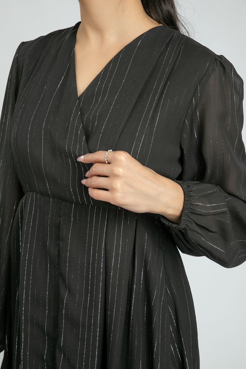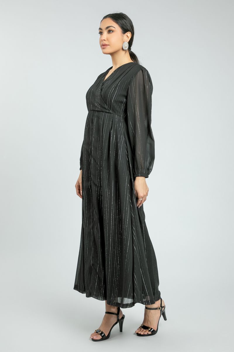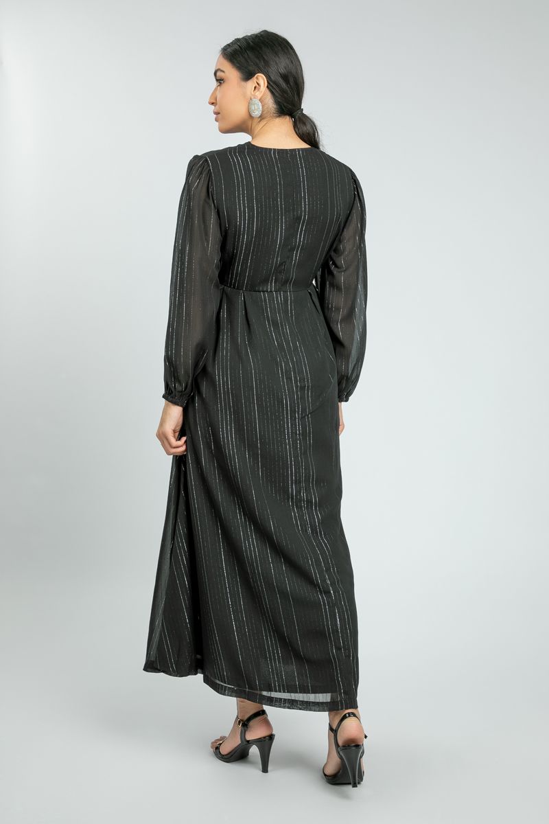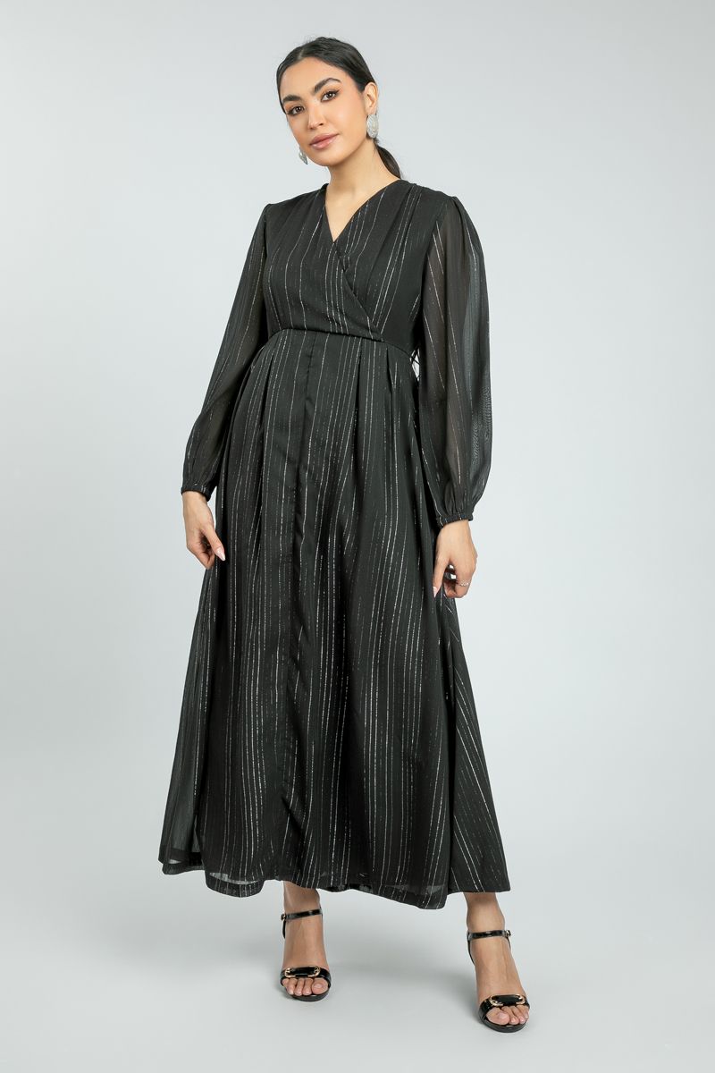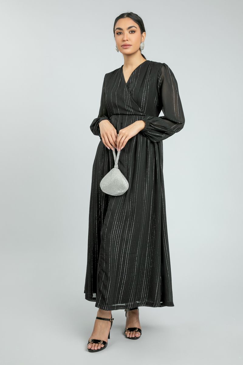 يتميز هذا الفستان الماكسي الأنيق من مجموعة عيد للأزياء النسائية بأكمام طويلة ونمط خطوط معدنية لامعة تضيف لمسة من الفخامة. يخلق القطع الملفوف في الجزء العلوي مظهراً جذاباً، بينما تضيف التفاصيل المُجعدة في الجزء السفلي لمسة من الانسيابية والنعومة. مع ياقة على شكل V وإغلاق بسحّاب في الخلف، يجمع هذا الفستان بين الأناقة والراحة. مثالي للاحتفال بهذه المناسبة الخاصة بأناقة.
