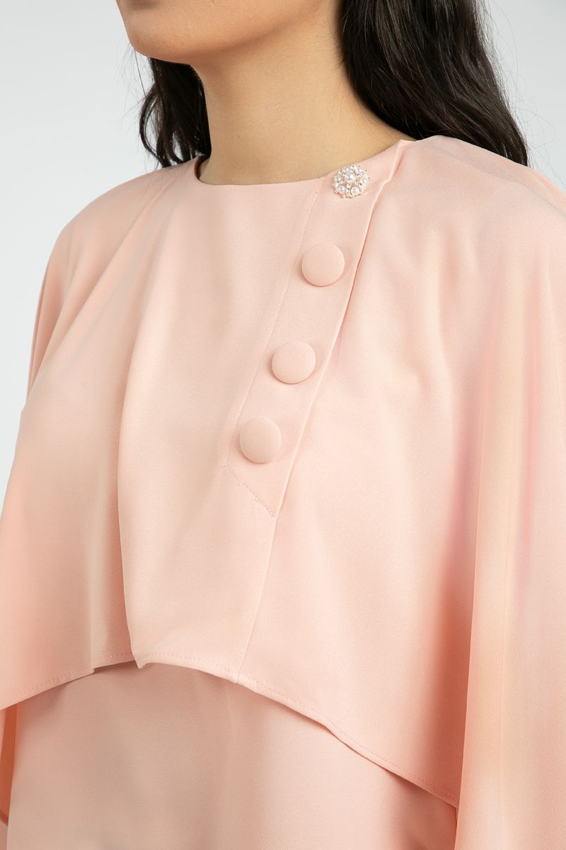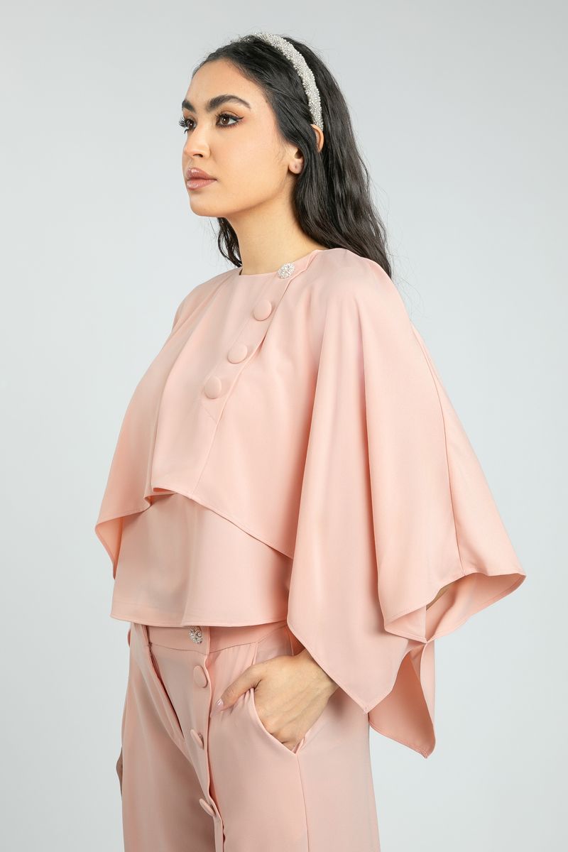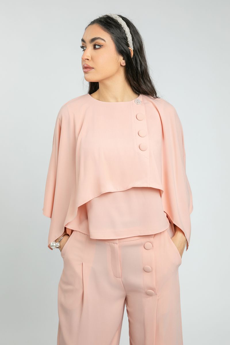 تُعد هذه البلوزة بتصميم الكيب متعدد الطبقات والمقصر من القطع الأنيقة التي لا غنى عنها في خزانة عيدك. تتميز بلون موحد مع تفاصيل أزرار بنفس اللون على الجهة الأمامية، مما يضيف لمسة من الأناقة الرفيعة. الإغلاق بزر في الخلف يضمن ملاءمة مثالية، بينما العنق المستدير يحافظ على المظهر الكلاسيكي والمُصقل. مثالية للاحتفالات بالعيد، ستضيف هذه البلوزة لمسة مميزة على إطلالتك المميزة في هذا الموسم.
