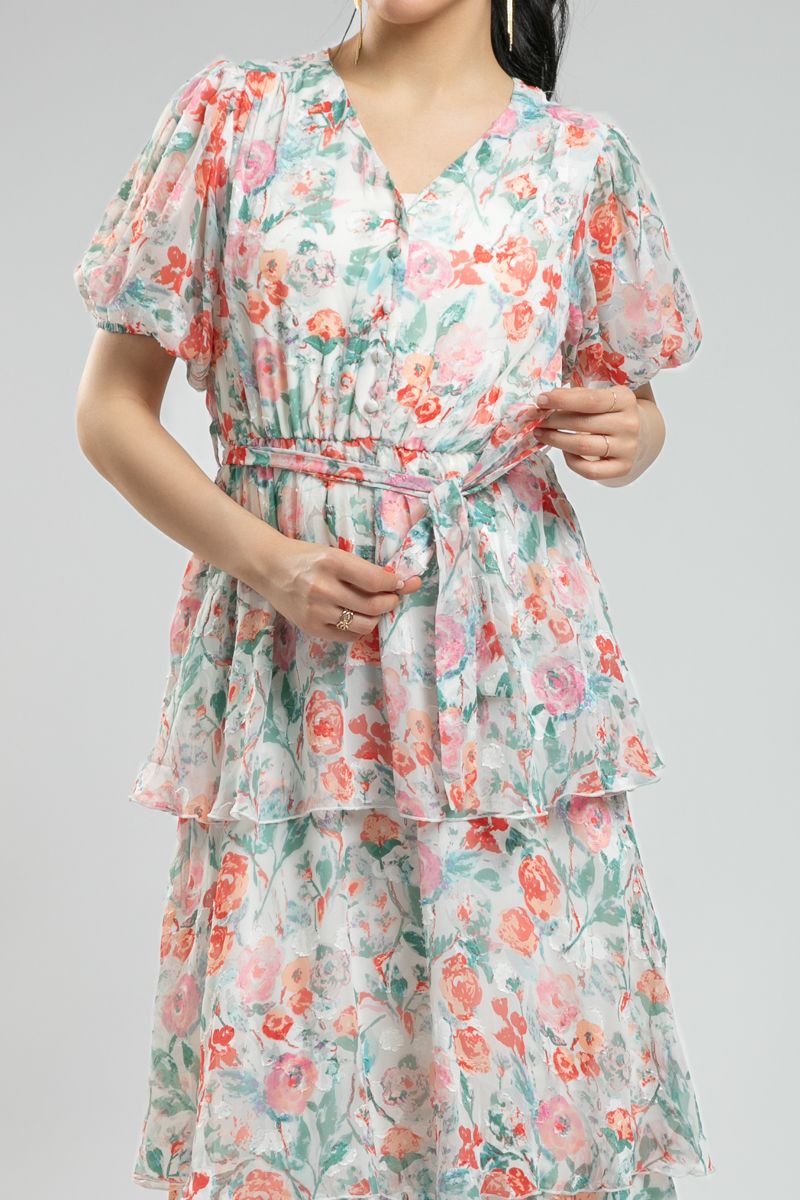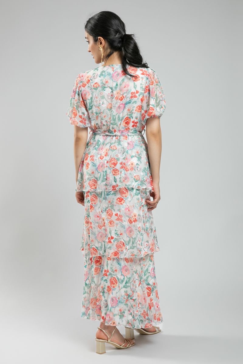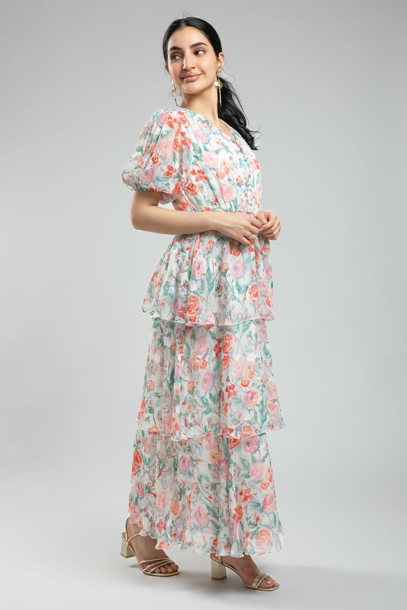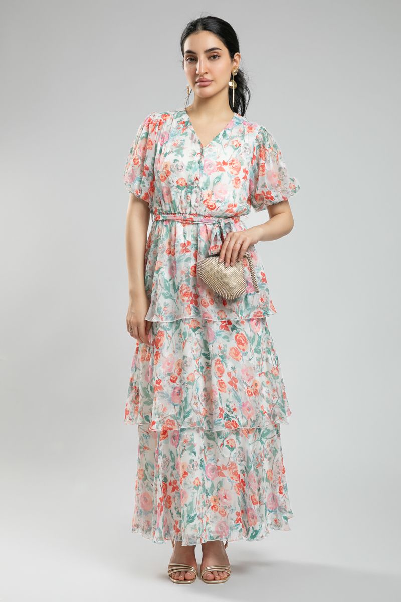 فستان نسائي ماكسي بنقشة زهور - بأكمام قصيرة منتفخة وكشكش طبقات