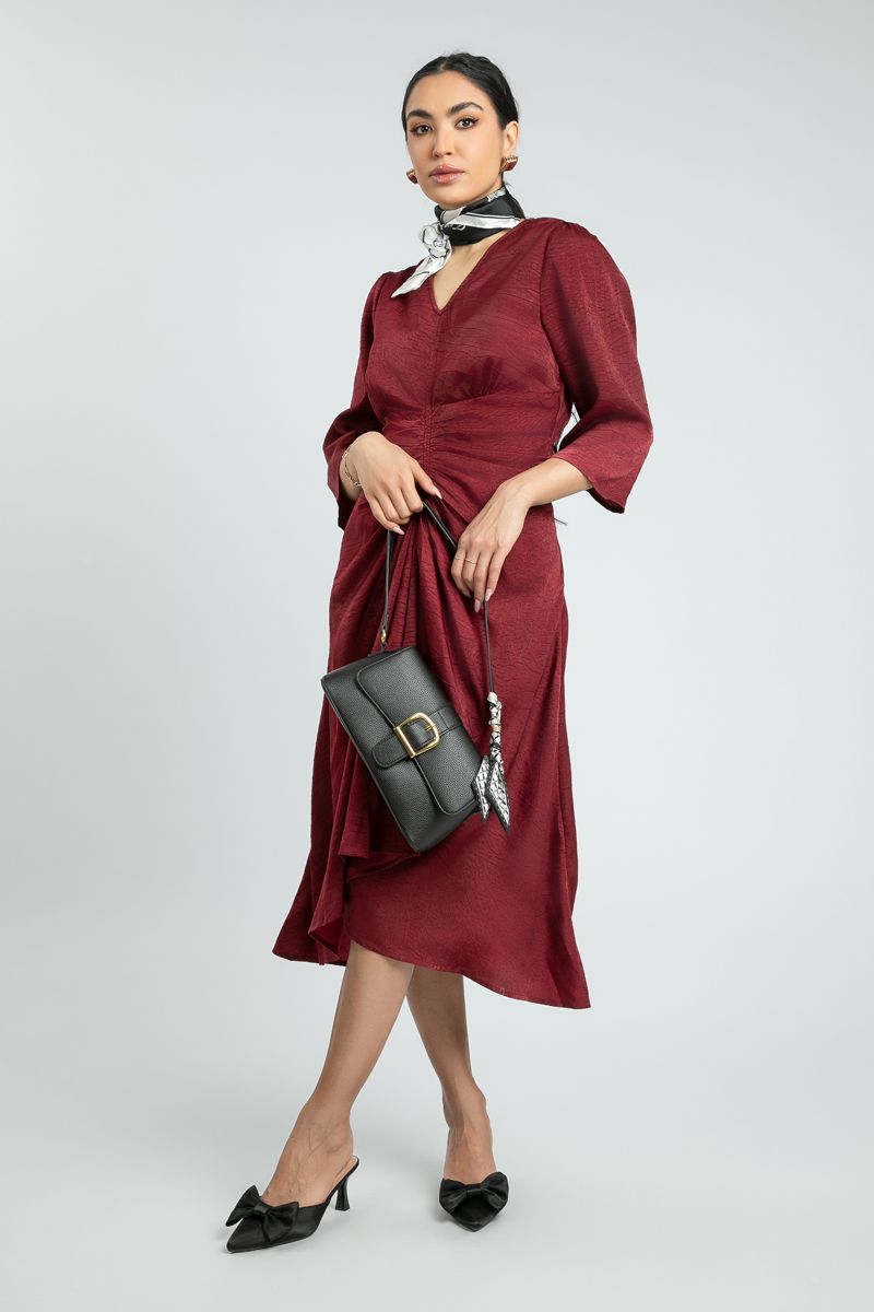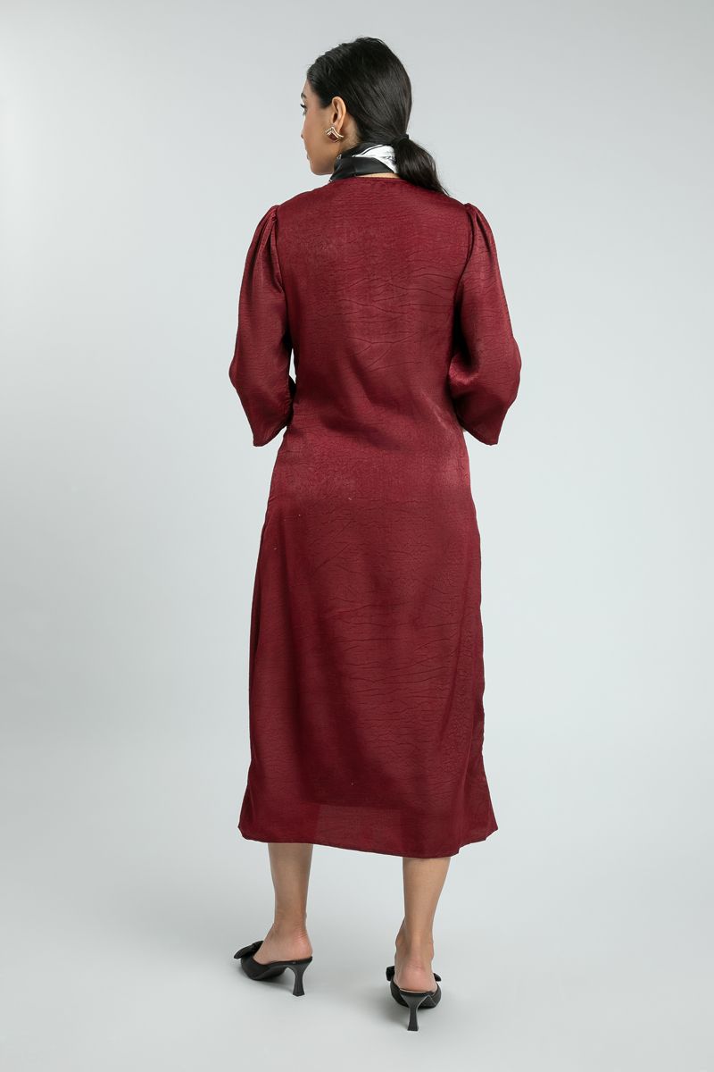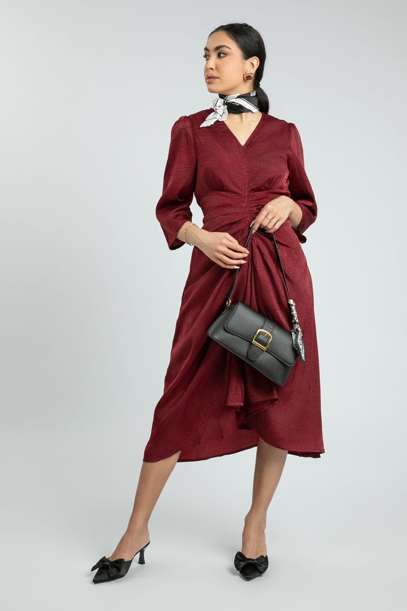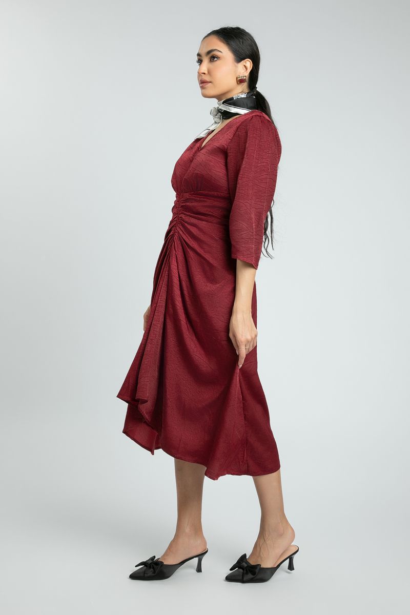 يتميز هذا الفستان الميدي الأنيق للنساء بأكمام ثلاث أرباع وقماش مزخرف يضيف عمقًا وأسلوبًا راقيًا. تم تزيين الجهة الأمامية بتفاصيل مطوية، مما يخلق مظهرًا متناسقًا وجذابًا. يبرز العنق على شكل حرف V التصميم الأنيق، بينما يوفر اللون الموحد تنوعًا يناسب جميع المناسبات. يعد هذا الفستان خيارًا مثاليًا سواء للمناسبات الرسمية أو غير الرسمية.